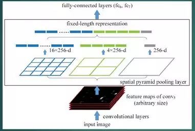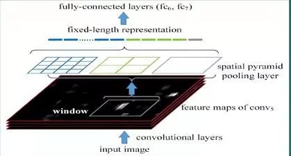 有没有方法提速呢?答案是有的,这2000个region proposal不都是图像的一部分吗,那么我们完全可以对图像提一次卷积层特征,然后只需要将region proposal在原图的位置映射到卷积层特征图上,这样对于一张图像我们只需要提一次卷积层特征,然后将每个region proposal的卷积层特征输入到全连接层做后续操作。 但现在的问题是每个region proposal的尺度不一样,而全连接层输入必须是固定的长度,所以直接这样输入全连接层肯定是不行的。SPP Net恰好可以解决这个问题。SPP NetSPP:Spatial Pyramid Pooling(空间金字塔池化) SPP-Net是出自2015年发表在IEEE上的论文-《Spatial Pyramid Pooling in Deep ConvolutionalNetworks for Visual Recognition》。 众所周知,CNN一般都含有卷积部分和全连接部分,其中,卷积层不需要固定尺寸的图像,而全连接层是需要固定大小的输入。