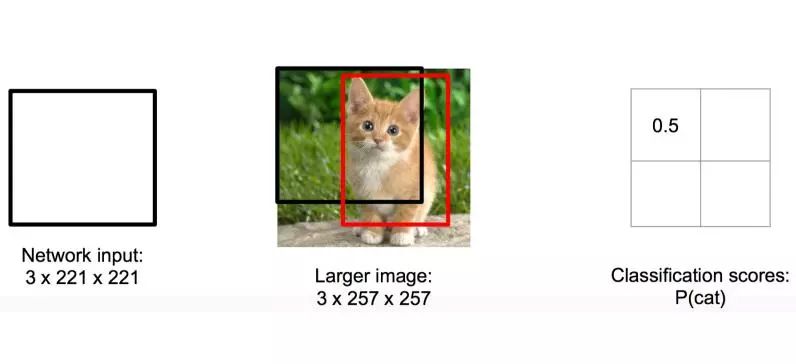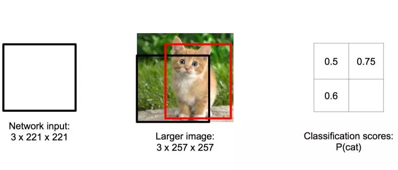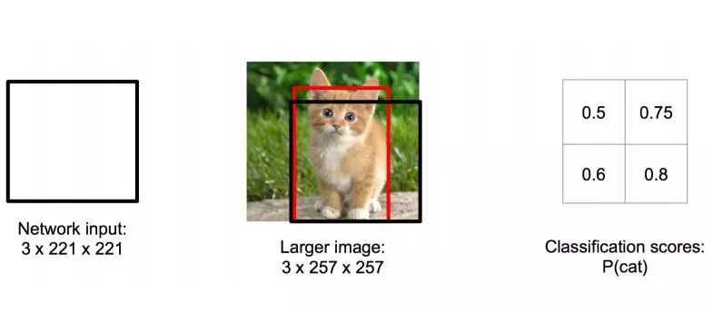 根据得分的高低,我们选择了右下角的黑框作为目标位置的预测。 注:有的时候也会选择得分最高的两个框,然后取两框的交集作为最终的位置预测。 疑惑:框要取多大? 取不同的框,依次从左上角扫到右下角。非常粗暴啊。 总结一下思路: 对一张图片,用各种大小的框(遍历整张图片)将图片截取出来,输入到CNN,然后CNN会输出这个框的得分(classification)以及这个框图片对应的x,y,h,w(regression)。