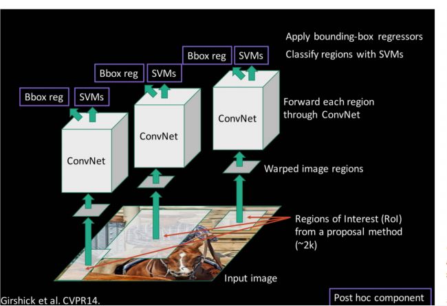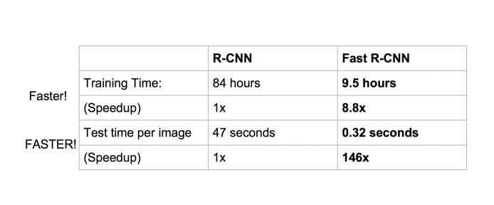 细心的同学可能看出来了问题,R-CNN第一步中对原始图片通过Selective Search提取候选框region proposal(2000个左右)之后,将每个proposal当成一张图像进行后续处理(CNN提特征+SVM分类),实际上对一张图像进行了2000次提特征和分类的过程。导致R-CNN检测速度很慢,一张图都需要47s。