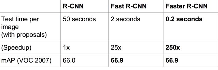 所以,Fast-RCNN很重要的一个贡献是成功的让人们看到了Region Proposal + CNN这一框架实时检测的希望,原来多类检测真的可以在保证准确率的同时提升处理速度,也为后来的Faster R-CNN做下了铺垫。画一画重点:R-CNN有一些相当大的缺点(把这些缺点都改掉了,就成了Fast R-CNN)。 大缺点:由于每一个候选框都要独自经过CNN,这使得花费的时间非常多。 解决:共享卷积层,现在不是每一个候选框都当做输入进入CNN了,而是输入一张完整的图片,在第五个卷积层再得到每个候选框的特征 原来的方法:许多候选框(比如两千个)-->CNN-->得到每个候选框的特征-->分类+回归 现在的方法:一张完整图片-->CNN-->得到每张候选框的特征-->分类+回归 所以容易看见,Fast R-CNN相对于R-CNN的提速原因就在于:不过不像R-CNN把每个候选区域给深度网络提特征,而是整张图提一次特征,再把候选框映射到conv5上,而SPP只需要计算一次特征,剩下的只需要在conv5层上操作就可以了。 在性能上提升也是相当明显的: