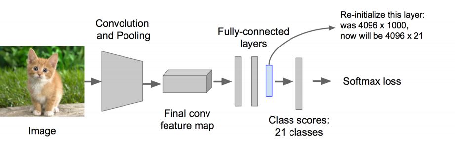 R-CNN的简要步骤如下(1) 输入测试图像 (2) 利用选择性搜索selective search算法在图像中从下到上提取2000个左右的可能包含物体的候选区域Region Proposal (3) 因为取出的区域大小各自不同,所以需要将每个Region Proposal缩放(warp)成统一的227x227的大小并输入到CNN,将CNN的fc7层的输出作为特征 (4) 将每个Region Proposal提取到的CNN特征输入到SVM进行分类 具体步骤则如下 步骤一:训练(或者下载)一个分类模型(比如AlexNet)步骤二:对该模型做fine-tuning • 将分类数从1000改为20 • 去掉最后一个全连接层