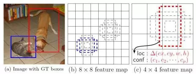 小结:YOLO将目标检测任务转换成一个回归问题,大大加快了检测的速度,使得YOLO可以每秒处理45张图像。而且由于每个网络预测目标窗口时使用的是全图信息,使得false positive比例大幅降低(充分的上下文信息)。 但是YOLO也存在问题:没有了region proposal机制,只使用7*7的网格回归会使得目标不能非常精准的定位,这也导致了YOLO的检测精度并不是很高。SSD (SSD: Single Shot MultiBox Detector) 上面分析了YOLO存在的问题,使用整图特征在7*7的粗糙网格内回归对目标的定位并不是很精准。那是不是可以结合region proposal的思想实现精准一些的定位?SSD结合YOLO的回归思想以及Faster R-CNN的anchor机制做到了这点。