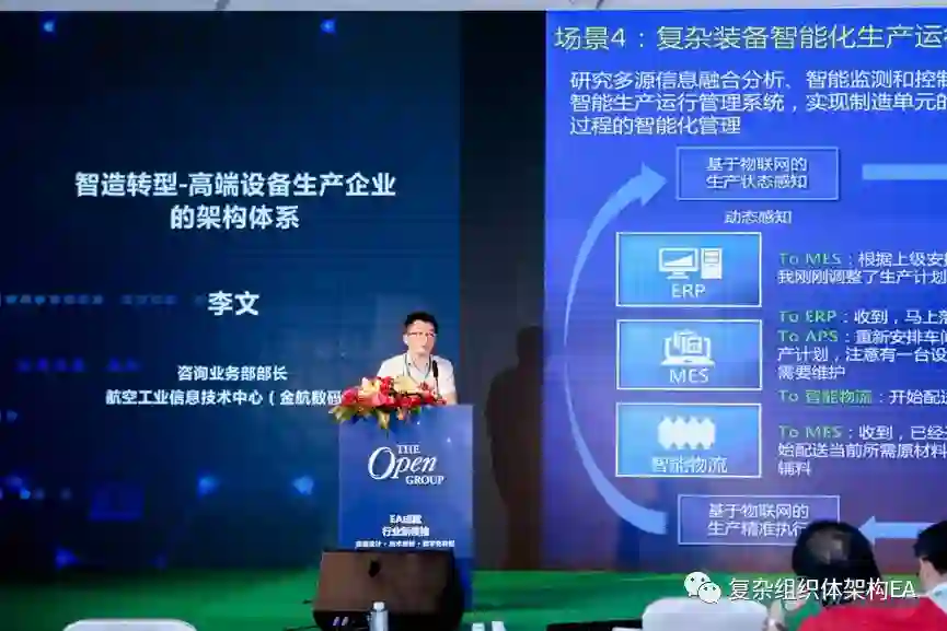 信息技术中心咨询业务部部长李文分享了智造转型——高端设备生产企业的架构体系,阐述了使用EA,如何帮助企业做好智能制造架构顶层设计,明晰了企业控制层、生产层、管理层和联盟层智能制造的要素的内涵,有效指导智能制造在企业的全面落地。