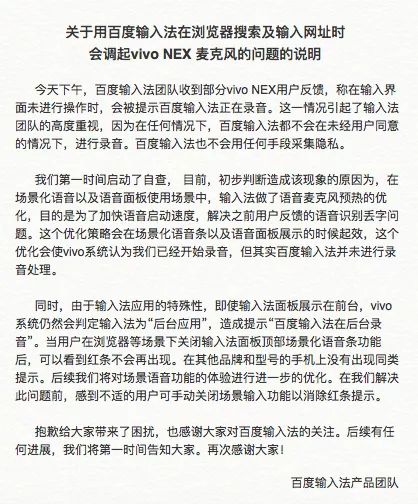 近日,有微博用户爆料,用户在vivo NEX上使用百度输入法在打开手机自带的浏览器进行搜索的时候,在无任何操作的情况下,手机顶部显示“百度输入法正在录音”,并且会提示用户是否要禁止它。百度输入法官方微博回应称,只需要关闭智能场景语音功能后就可以消除该问题。