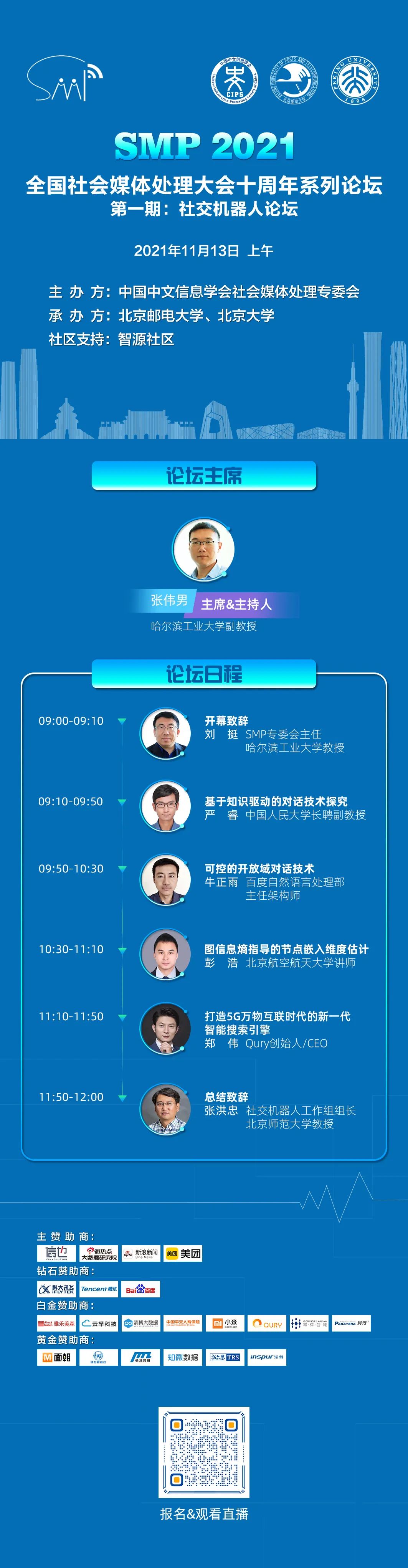 将于2021年11月13日(周六)上午线上举办,旨在探讨社交机器人领域的热点和前沿,探索构建更智能的社交机器人的学术研究和技术方案。