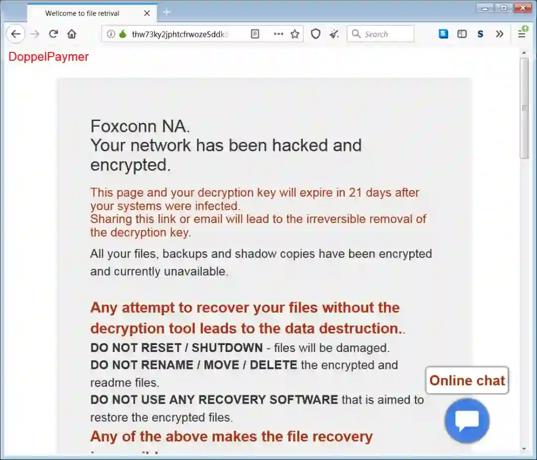 DoppelPaymer 勒索软件团队在采访时证实,他们的确在 11 月 29 日袭击了富士康在北美的工厂,但并未袭击整个公司。
