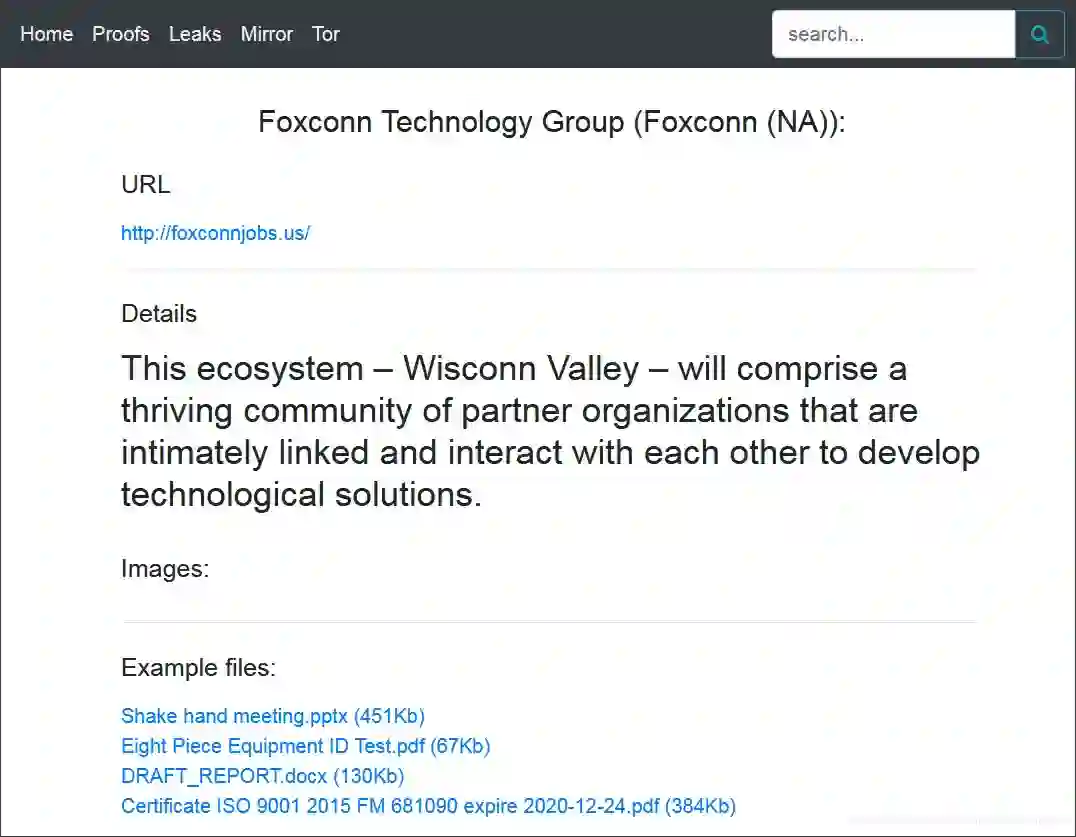 近日, DoppelPaymer 勒索软件在其勒索软件数据泄漏站点上发布了属于富士康的文件。泄漏的数据包括常规业务文档和报告,但不包含任何财务信息或员工的个人详细信息。