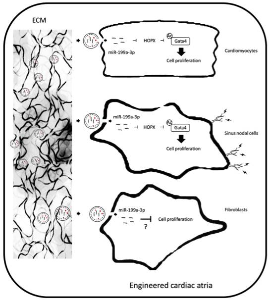 miR-199a-3p在工程化心房中的作用工作模式图。与新生心肌细胞和工程化心房中的窦淋巴结细胞相比,心脏成纤维细胞具有高增殖率的倾向。然而,通过抑制HOPX蛋白表达,心房ECM衍生的miR-199a-3p可以通过Gata4乙酰化的机制优先加速新生心肌细胞和窦淋巴结细胞而不是成纤维细胞的增殖,从而改善工程心房中心肌细胞的电活动和生长。