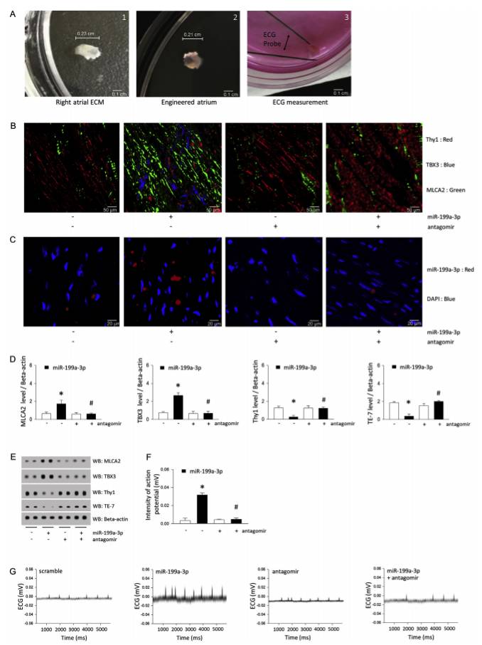 细胞外基质(ECM)在为心脏组织的适当再生提供必要的微环境中起关键作用。然而,导致ECM介导的心脏再生的具体机制尚不清楚。为了阐明潜在的机制,研究人员使用电子显微镜研究了心脏ECM的超微结构。有趣的是,从脱细胞右心房观察到大量微囊泡。RNA和蛋白质分析显示这些微囊泡含有外泌体蛋白和miRNA,研究人员将其称为ECM衍生的细胞外囊泡(ECM-EVs)。来自ECM-EVs的特异性miRNA miR-199a-3p通过抑制同源域纯蛋白(HOPX)表达和增加GATA结合蛋白4(Gata4)乙酰化促进分离的新生心肌细胞和窦淋巴结细胞的细胞生长。为了确定机制,研究人员敲除了Gata4,并证明了miR-199a-3p的作用需要Gata4作用于分离的新生心肌细胞和窦淋巴结细胞中的细胞增殖。为了进一步探索这种miRNA的作用,分离出新生心脏细胞,并将其种到心房ECM中,这里称为工程化心房。miR-199a-3p介导心肌细胞和窦淋巴结细胞群的富集,并且改善了工程化心房中窦淋巴结细胞的心电图信号活性。重要的是,miR-199a-3p的antagomir能够消除工程心房中miR-199a-3p的这些作用。进一步研究显示Ang II输注的窦性淋巴结功能障碍动物模型中,miR-199-3p处理的心脏细胞显著改善并恢复了电活动。总之,这些结果提供了ECM关键作用的明确证据,不仅提供了心脏组织生长的支架,而且通过ECM衍生的miR-199a-3p促进心房电生理功能。