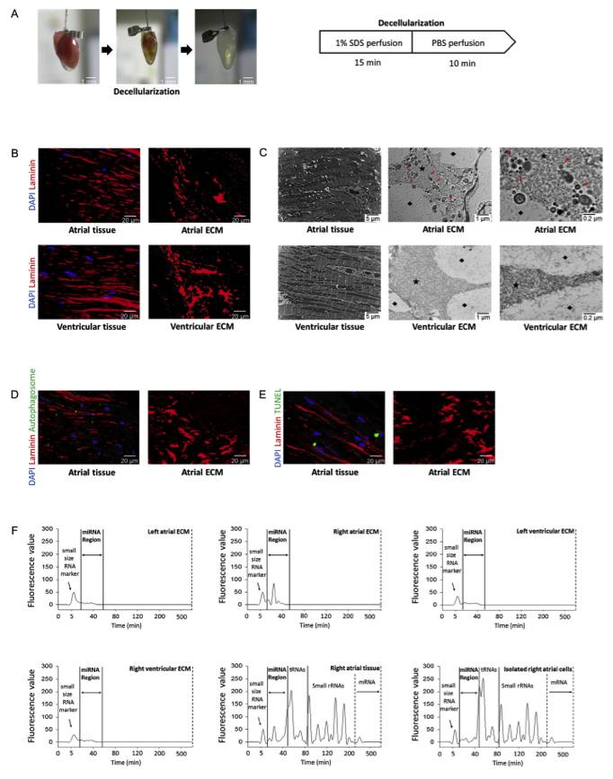 首先,在脱细胞的心脏(将心脏的细胞去除,仅留下细胞外基质成分,ECM)中发现了大量的微小囊泡(EVs)和miRNA成分。