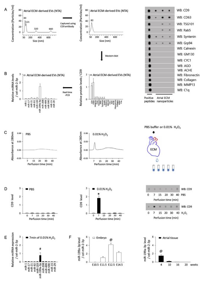 ECM-EVs的分析。使用超速离心机和CD9抗体介导的捕获从心房ECM分离纳米囊泡,并用纳米粒子跟踪分析(NTA)测定。并分析了捕获的纳米囊泡中的蛋白质和miRNA。在用PBS或0.01%H2O2灌注到心脏ECM中后,收集冠状流出液,并在每个管中记录280 nm的吸收峰。Western印迹显示在H2O2灌注7分钟时检测到CD9蛋白水平。检测了来自洗脱溶液的EVs衍生的miRNA谱和来自4至20周龄小鼠心脏各阶段和心房组织的胚胎中miR-199a-3p水平。