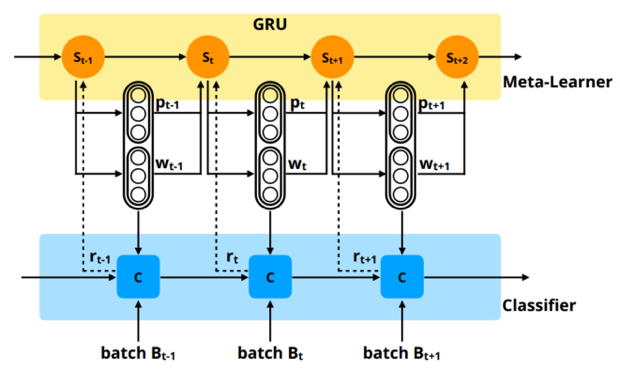Meta-learner 的结构采用了 GRU,采用了强化学习的方法去进行weight policy和decision policy的学习。其中,强化学习的state是GRU的隐层表示: