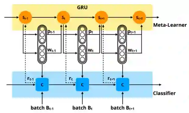 模型图如图1所示,基本结构分为两部分:meta-learner 和 classification model。Meta-learner的任务是学习 weight policy 和 decision policy,即权重和阈值两个超参;Classification model 根据学习到的两个超参,训练一个 Batch,并进行测试得到测试结果,并以测试结果作为 reward 去更新 meta-learner 和 classification model的参数。
