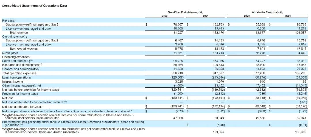 根据最新的文件,GitLab 在今年 2 月 1 日至 7 月 31 日期间半年收入 1.08 亿美元,净亏损 6900 万美元,相比之下,去年的同期的收入为 6400 万美元,亏损 4400 万美元。