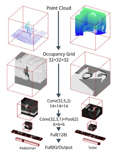 Maturana 和 Scherer 在 2015 年提出的 VoxNet(2015)是最早在给定体素网格输入的情况下在物体分类任务上取得优异表现的深度学习方法。VoxNet 使用的是概率占用网格,其中的每个体素都包含了该体素在空间中被占用的概率。这样做的一个好处就是,它允许网络区分已知是自由的体素(例如,激光雷达光束经过的体素)和占用情况未知的体素(例如,激光雷达击中位置后方的体素)。