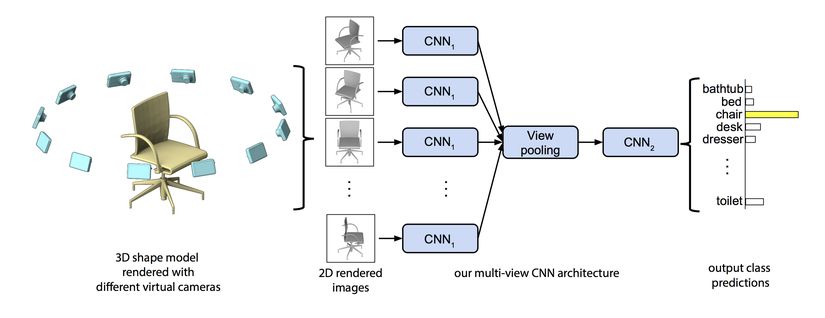 使用三维数据的多视图表示是将二维深度学习技术应用到三维场景下的最简单的方式。这是一种将三维感知问题转化为二维感知问题的明智做法,但它仍然在某种程度上允许你对物体的三维几何结构进行推理。早期的利用这种思想的基于深度学习的工作是 Su 等人在 2015 年提出的 multi-view CNN。