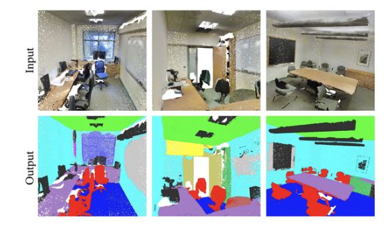 使用 PointNet 得到的室内场景的语义分割结果(来源:PointNet)