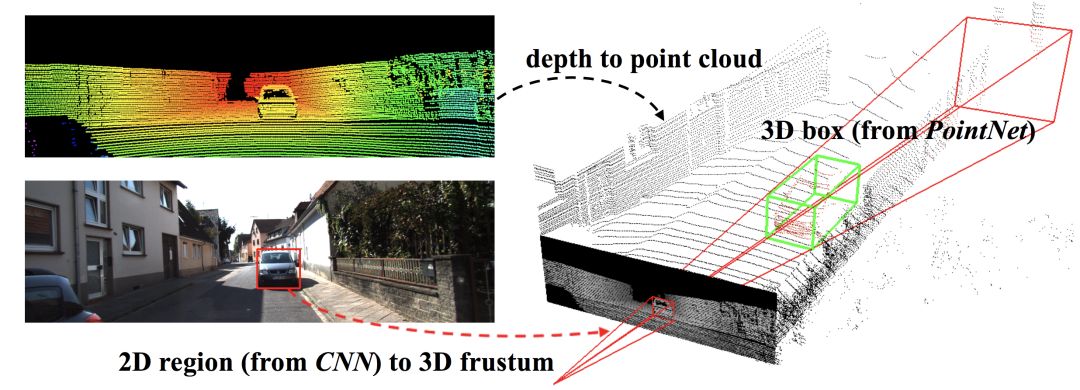 基于同时使用二维数据和三维数据的思路,Qi 等人的 Frustrum PointNet 于 2017 年提出了一种将 RGB 图像和点云融合从而提高在大型三维场景中定位物体的新方法。传统的解决该任务的方法是通过直接在整个点云上的滑动窗口上执行分类来确定物体可能的三维边界框,这样做的计算开销非常大,并且很难进行实时预测。Qi 等人的工作有两个主要的贡献。首先,他们建议首先使用标准的卷积神经网络在二维图像上进行物体检测,提取出一个与待检测的物体可能从属点云区域相对应的三维边界框,然后在点云的这个「切片」上进行搜索。这大大缩小了边界框估计的搜索空间,减少了检测错误的可能性,在很大程度上简化了处理流程,这对自动驾驶应用十分关键。其次,Qi 等人设计了一种新颖的基于 PointNet 的架构,它可以直接对实例进行分割(将点云分割为一个个独立的物体),并一次性地在整个三维边界框中进行边界框估计,而不是在边界框搜索过程中执行经典的滑动窗口分类工作。这使得他们的方法对遮挡和稀疏等情况即迅速又鲁棒。最终,由于这些改进,这项工作发布时,它在 KITTI 以及 SUN RGB-D 检测等对比基准上比之前所有的方法都取得了更好的性能。
