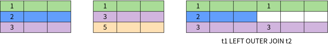 左外连接(Left Outer Join)返回左表中所有的数据;对于右表,返回满足连接条件的数据;如果没有就返回空值。左外连接的原理如下图所示: