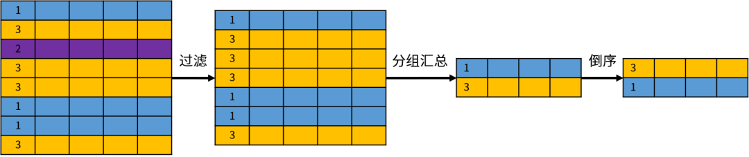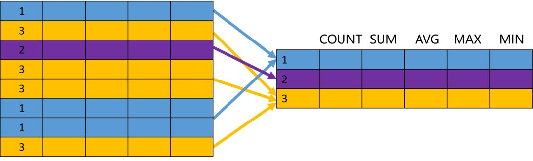 所以说,GROUP BY 改变了集合元素(数据行)的结构,创建了一个全新的关系。分组操作的示意图如下: