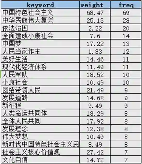 十九大报告全文3万余字,本文使用NLPIR对十九大报告进行关键词提取,以期揭示十九大报告的核心要点。关键词top100结果展示如下:
