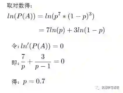 我们假设7次黑球,3次红球为事件 A ,一个理所当然的想法就是既然事件 A已经发生了,那么事件 A 发生的概率应该最大。所以既然事件 A 的结果已定, 我们就有理由相信这不是一个偶然发生的事件,这个已发生的事件肯定一定程度上反映了黑球在整体中的比例。所以我们要让模型产生这个整体事件的概率最大,我们把这十次抽取看成一个整体事件 A ,很明显事件 A 发生的概率是每个子事件概率之积。我们把 P(A) 看成一个关于 p 的函数,求 P(A) 取最大值时的 p ,这就是极大似然估计的思想。具体公式化描述为P(A)=p^7*(1-p)^3。