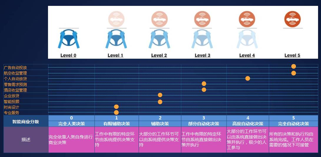 我们知道自动驾驶领域对自动化程度有一个从level0到level5的分级方法,这里我借用这个体系对不同行业的智能决策支持的自动化现状做了评价。