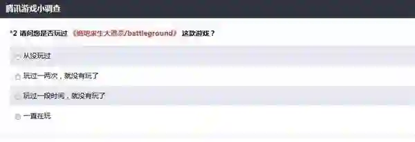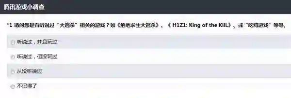 问卷开始询问了玩家是否玩过《绝地求生》和《H1Z1》等游戏。让玩家选择了这类游戏中吸引人的亮点以及缺点。