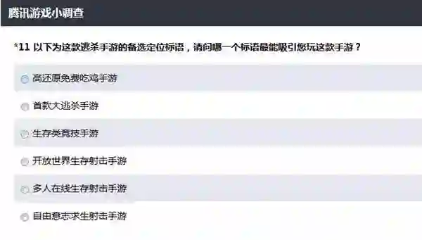 然后直接询问玩家对于大逃杀类手游的态度,对于不感兴趣的玩家询问了理由。还提供了游戏图标和宣传语的评选,征询吸引你的原因。