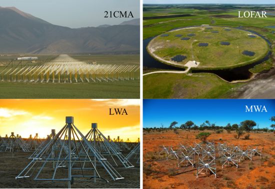 图2. 几个探测宇宙再电离21cm信号的阵列:21CMA(中国),LOFAR(荷兰),LWA(美国),MWA(澳大利亚)