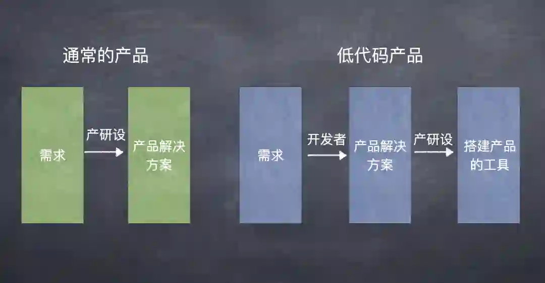 对于大多数产品来说,它是围绕着需求而生的,从业务/用户需求到产品需求,从产品需求到产品;而对于低代码产品来说,它是围绕着产品而生的,从业务/用户需求到产品,从产品到搭建产品的工具。