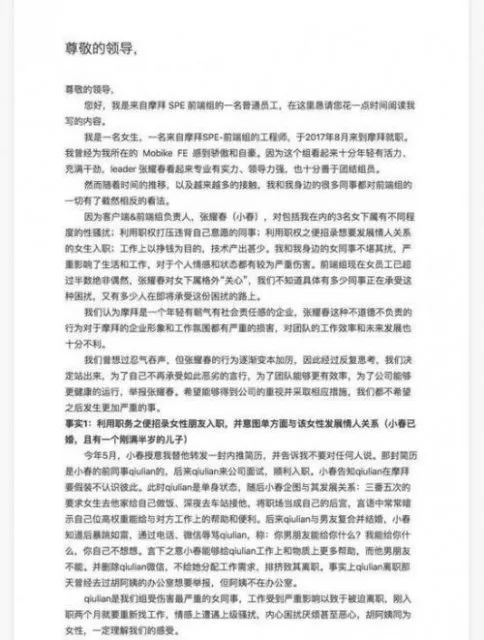 根据网上流传的截图显示,举报人员为摩拜 SPE 前端组的一名女员工,于2017年8月就职摩拜。她在信中称,摩拜客户端&前端组负责人张某对包括自己在内的3名女下属进行性骚扰,利用职权打压违背他意愿的同事。
