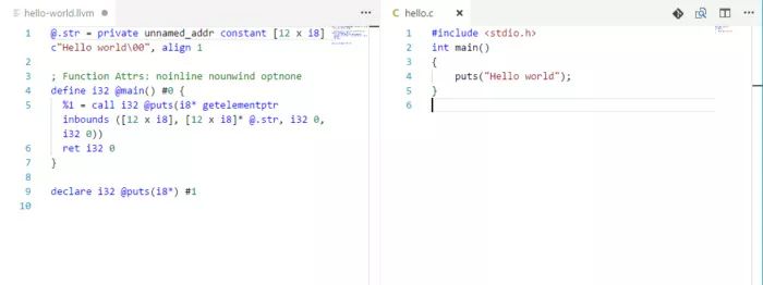 这是一个 LLVM 中间代理(IR)的例子。右边是一个简单的 C 程序;左边是由 Clang 编译器翻译成 LLVM IR 的代码。