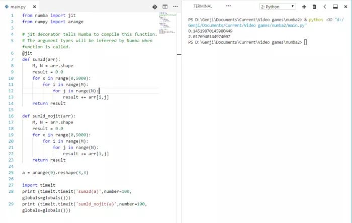 Numba 使用 LLVM 进行即时编译数字代码并加速其执行。JIT 加速过的 sum2d 函数的执行速度比常规 Python 代码快 139 倍。