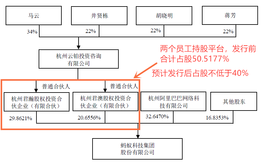 再看一看招股说明书披露的股权及数据内容,蚂蚁集团的两个员工持股平台,杭州君瀚和杭州君澳分别持有公司29.86%和20.66%的股份,两者合计持有发行人50.52%的股份,发行后合计持股比例将不少于40%。