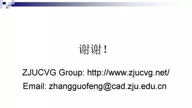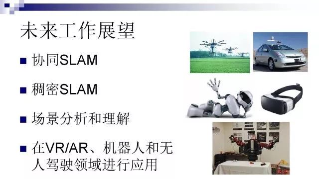 最后是对未来工作进行展望。我们接下来要做的一个工作是协同SLAM,比如使用多个无人小飞机进行协同配合完成一个指定的任务。另外一个工作是稠密SLAM,这个也是目前我们正在做的一个工作。此外,就是基于SLAM的场景分析和理解。最后,基于这些技术在VR、AR、机器人和无人驾驶领域进行应用。