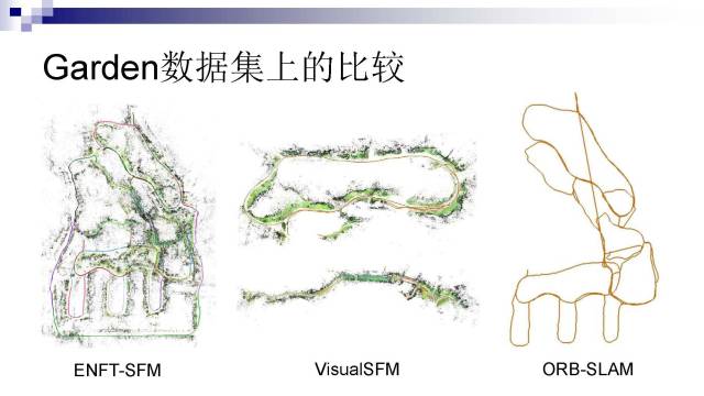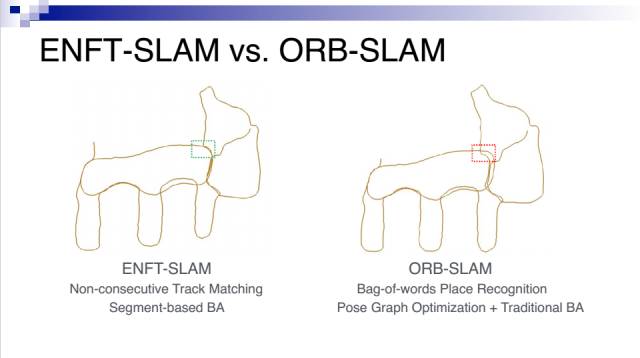 这是我们的ENFT-SLAM和ORB-SLAM的比较,输入的数据都是实时的单目视频序列。可以看到我们的结果更好。主要是我们在两个模块上做得更好:一是我们的非连续轨迹匹配比ORB-SLAM采用的Bag-of-words Place Recognition方法能匹配上更多的公共特征点;二是我们使用的基于分段的集束优化方法,不容易陷入局部最优解,比起ORB-SLAM采用的位姿图优化和传统集束优化结合的方法效果更好。