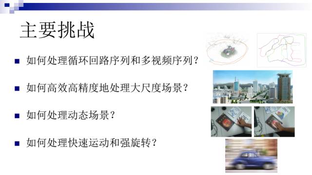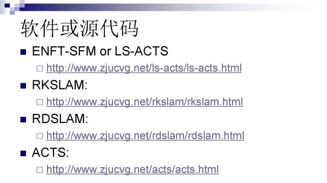 研发了一个大尺度运动恢复结构系统ENFT-SFM,能够高效地处理循环回路和多视频序列;在单目SLAM方面,主要做了三个方面的工作,其中ENFT-SLAM是在ENFT-SFM上的进一步改进和实时化,能在大尺度场景下实时运行,RDSLAM则主要针对动态场景做了优化,而RKSLAM专为基于移动终端的增强现实应用设计,速度非常快,可以在移动设备上实时运行。另外,针对RGB-D摄像头,我们最近也做了一个基于关键帧的同时定位与稠密地图构建系统RKD-SLAM。接下来将分五部分做详细介绍。
