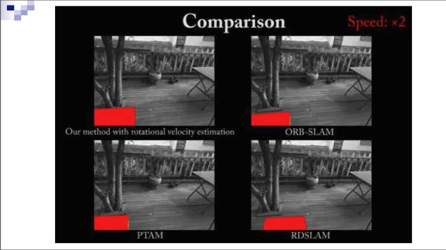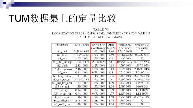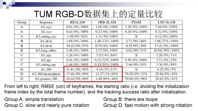 这是我们在TUM RGB-D数据集上的定量比较。这里我们只用了RGB信息,没有用深度信息。我们选了12组序列,分成了4组。其中Group D的序列都是相机运动非常快而且带有强旋转。实验结果表明,在Group D的跟踪成功率上,我们的方法要明显好于ORB-SLAM和其他方法。