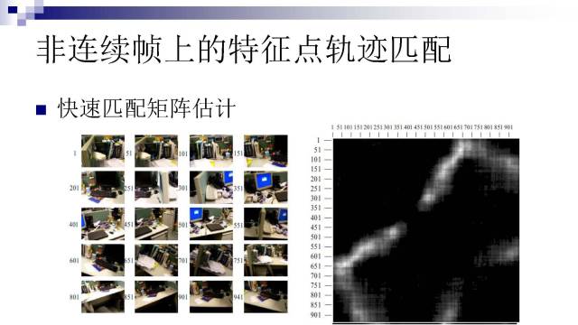 要做非连续帧的特征轨迹匹配,首先需要知道哪两帧之间有共同内容,否则采用暴力匹配,计算复杂度非常高。这部分可以用一些类似bag of words 的方法快速估计匹配矩阵,匹配矩阵的横纵坐标值代表帧号,矩阵元素的数值代表某两帧之间的可能匹配点的数量。