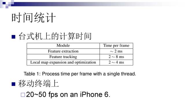 RKSLAM的速度非常快。在台式机上可以达到每秒100~200帧,在iPhone6上可以达到每秒20~50帧,完全能够满足实时应用。