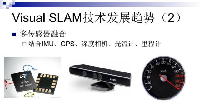 另外一个发展趋势就是多传感器融合。因为纯视觉方法或者基于单一传感器的方法总有其局限性,结合多种传感器信息(比如IMU、GPS、深度相机、光流计、里程计等等)可以形成优势互补,从而实现一个成本低、稳定性高的SLAM解决方案。