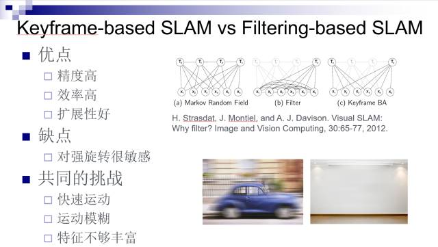 现在Visual SLAM技术方法主要分为两类,一个是keyframe-based SLAM,另一个是filtering-based SLAM。2012年Andrew Davison等人写了一篇文章对这两个方法进行了比较,得出这样的结论:keyframe-based SLAM比filtering-based SLAM在精度上、效率和扩展性上具有更好的性能。但是keyframe-based SLAM也有缺点,一般对强旋转比较敏感。当然,快速运动、运动模糊、特征不够丰富等情况对于这两类方法都很有挑战性。