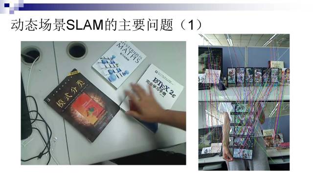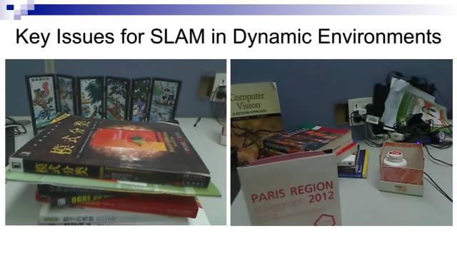 比如左边的例子,人在移动书本,过了几十秒所有的书本的位置都发生了变化,这对传统的SLAM来说是非常难处理的。另外,动态元素还会导致大量的错误匹配,这对实时稳定的SLAM求解来说也是非常困难的。