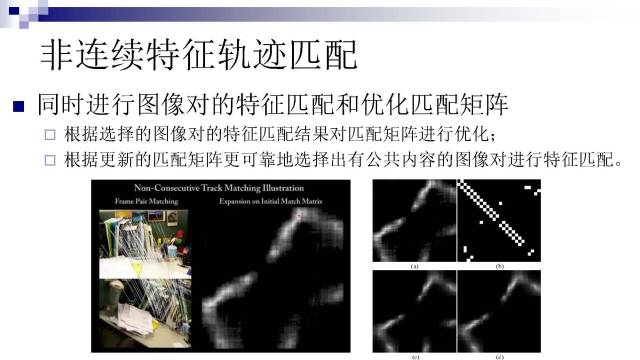 它可以分解成两个步骤:一个是连续的特征跟踪,另一个是非连续的轨迹匹配。在连续的特征跟踪上,我们提出了一个两遍匹配方法,可以显著提高特征点的跟踪轨迹寿命,不过这里主要重点讲述非连续的特征点轨迹匹配。