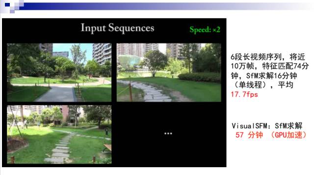 这里有一个对比,中间是Visual SFM的结果,它用我们的特征匹配结果,然后进行求解,在GPU加速的情况下,SfM求解需耗时57分钟。而我们的求解是在CPU下单线程做的,所以如果考虑GPU加速的因素,我们可以在速度上达到两个数量级的提升。