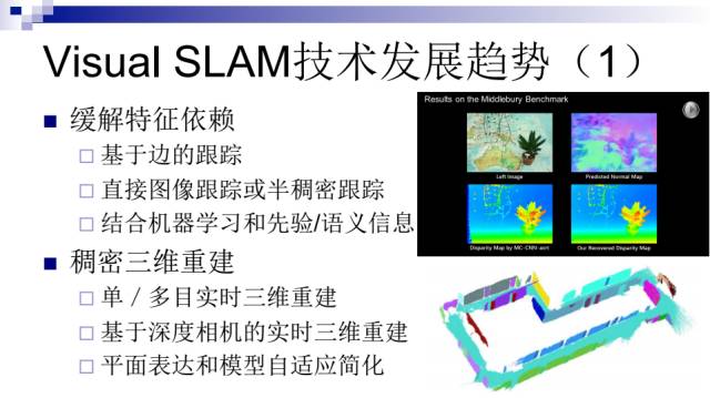 因为基于视觉的方法很依赖场景的特征丰富程度,所以需要一些方法去解决特征依赖问题,比如:基于边的跟踪,直接图像跟踪或半稠密跟踪,或者结合机器学习先验、语义信息。另外一个发展趋势是在朝着稠密三维重建的方向发展。比如基于单目或多目的实时三维重建,还有基于深度相机的实时三维重建。因为稠密三维重建需要的内存空间很大,如果要在移动端进行应用,往往还需要对模型进行简化。所以一些研究人员也提出采用平面表达和模型自适应去简化来解决这个问题。