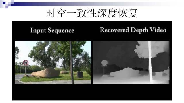 最后,顺便提一下我们比较早的一个深度恢复工作(2009年发表在TPAMI上),可以从一段输入的视频序列里自动地恢复出具有高度时空一致性的深度图序列。可以看到,恢复的深度图不仅在时序上具有高度一致性,而且在不连续边界也有很好的质量。