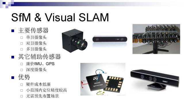SfM可以分为离线和实时的,而实时的SfM其实就是Visual SLAM。Visual SLAM主要采用摄像头传感器,根据摄像头的数目可以分为单目摄像头、双目摄像头和多目摄像头等。现在的Visual SLAM也在结合其它一些传感器,比如手机上的廉价IMU、GPS和一些深度摄像头来做到更加鲁棒的SLAM。