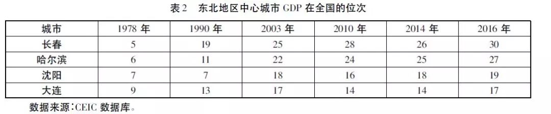 重点城市的对比,1978年沈阳、大连、哈尔滨分别排在全国第五、七、九位;加上鞍山和大庆,全国二十强,东北占据五席,现在二十强榜单已看不到它们的身影。